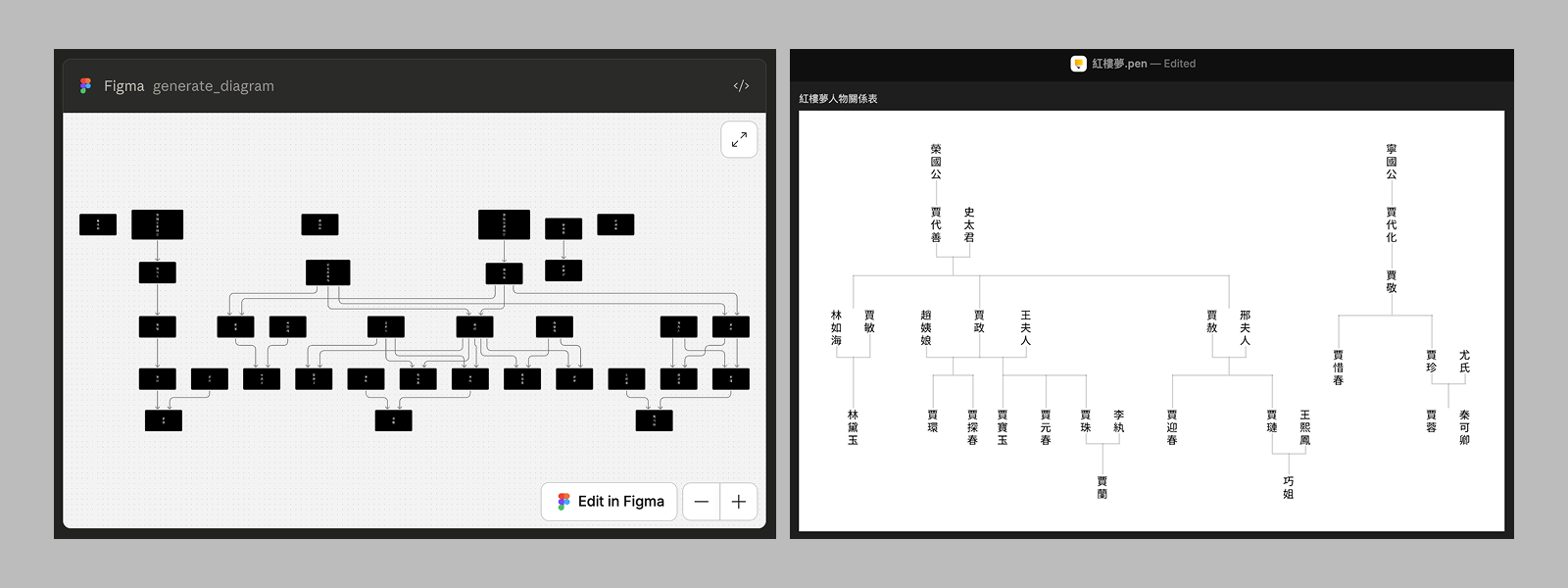 兩種 AI 工具生成出的《紅樓夢》人物關係圖表